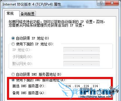 在属性对话框中选择“使用下面的DNS服务器地址”,在“首选DNS服务器(p)”一栏中输入“114.114.114.114”.然后选择确定即可。