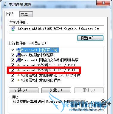 在弹出对话框中选择“网络”选项卡中的“Internet协议版本4(TCP/IPv4)”