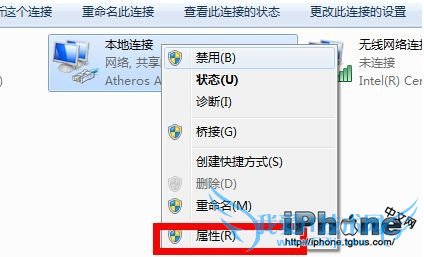 选中“本地连接”,右键弹出菜单,选择“属性”