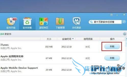 3、在卸载界面找到iTunes,然后点击右侧的“卸载”按钮卸载此软件。卸载完成后,打开iTunes软件安装包重新安装软件。