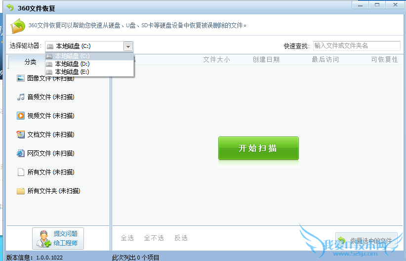 4、点击你要恢复文件的所在盘,或者直接输入文件或者文件夹名,然后点击“开始扫描”