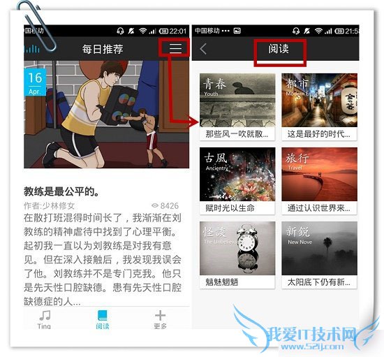 然后再来为大家奉献是“阅读”里的内容,阅读里有许多精彩的文章,点击右上角可以看到许多板块,比如青春啊都市啊,旅行啊等等,只有你想不到的,没有你找不到的,首先映入我们眼帘的是《教练是最公平的》。