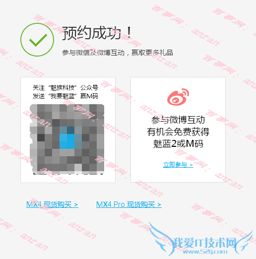 然后会提示我们预约成功,我们也可以扫码关注魅族科技或者分享到微博,要是幸运的话或许可以获得M码。