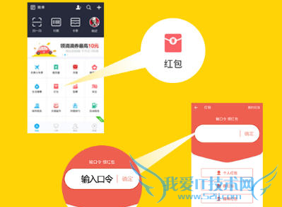 2.找到支付宝口令后,打开支付宝无线客户端,点击“红包”按钮,在红包发放时间开始后,输入对应口令,即可参与抢支付宝口令红包。