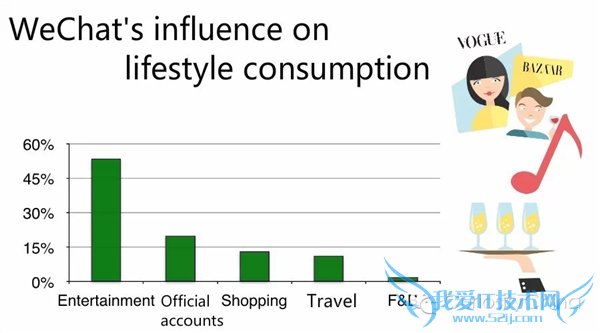 微信直接带动的消费支出中,娱乐占了53.6%、公众平台占了20.%、购物占了13.2%、出行占了11.3%、餐饮只有2%。据统计,微信直接带动的生活消费规模已达到110亿元、其中娱乐消费时最大支出,规模为58.91亿元。