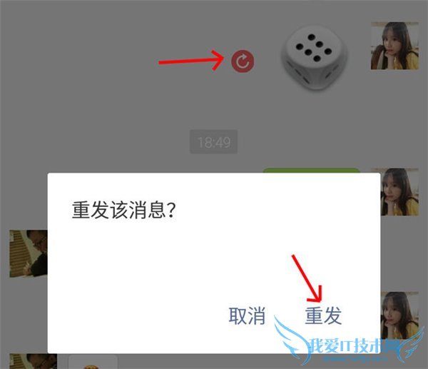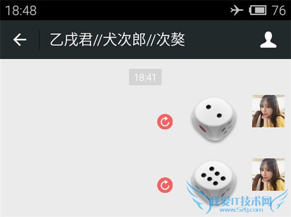 等全部骰子都被标志红色箭头圈圈时,关闭飞行模式,像别人发起玩骰子挑战吧!他摇出5点,你就从刚才发送失败的骰子中选一个6点的,点击红色箭头圆圈标志,确认重新发送。这样一来,对方那边就会在他的5点骰子之后,显示出你发送的6点的骰子。