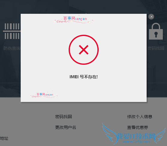 如果购买的是假的话,那么就会弹出如图对话框,此时就会提示我们”IMEI号不存在“。如果是真的话,查询IMEI号是可以查询出来的。