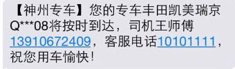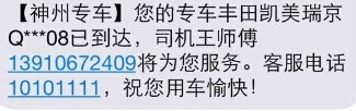 4、需求提交后,大约两三分钟就会收到手机消息,显示司机电话和车号。