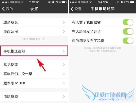 二,在【设置】界面就能看到【手机推送通知】设置了。大家进入后可以对赞自己的,评论,朋友发布的秘密进行选择是否接受推送。