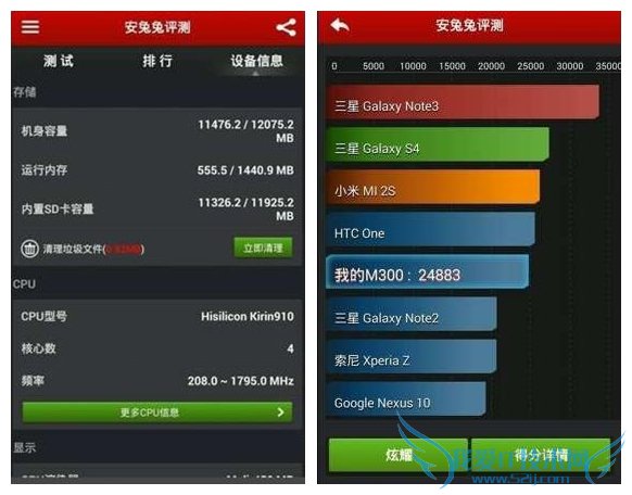 从上面截图显示该机的总成绩为24883分,比主频1.7GHz的MT6592真八核处理器性能稍次一些,但略强于MT6592M,总体来说颇为令人失望