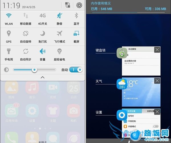 近期任务采用大缩略图模式,支持单个滑动移除和一键清除。需要注意的是,近期任务并非长按HOME键调出,而是长按最右侧的“菜单键”。