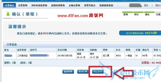 6、下面是最关键的了,也就是火车票费用支付步骤了,点“网上支付”。如下图所示: