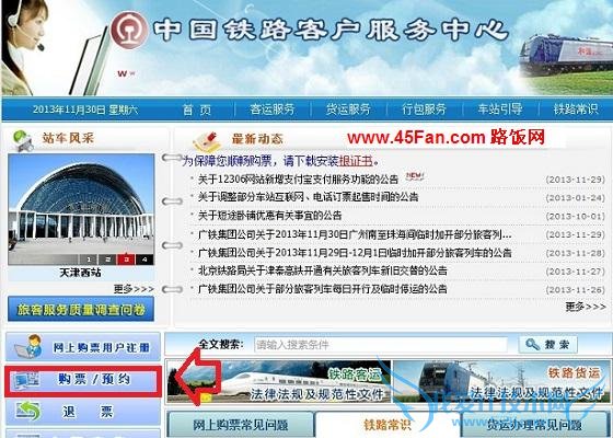 1、先登陆到12306官网,即在浏览器中输入www.12306.cn,进入后点击左侧选项的“购票/预约”。如下图所示: