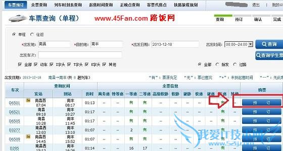 2、输入注册好的帐号和密码登陆进去,然后开始预定火车票,接着输入出发地地址、目的地地址、出发日期,点查询,稍等一会,在下方会出现车次。然后选择你要乘坐的车次,点右方的“预定”。如下图所示: