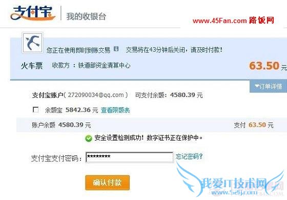 9、可能是为了稳妥起见,还需要输入一次支付宝购物密码,点“确认付款”,至此就完成了支付宝买火车票了。如下图所示: