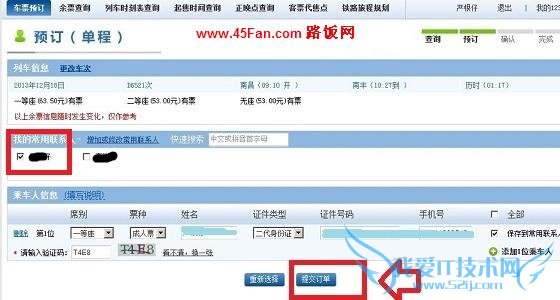 4、随即会弹出新窗口,如果之前预定过就直接勾选下方需要购票的人,如果是第一次购买,则需要“新增联系人”,联系人信息包括姓名、身份证号码等信息。咱们这里以之前已购票为例,点“提交订单”。如下图所示: