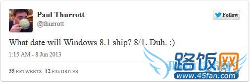 资深微软博主Paul Thurrott在Twitter上爆料称,Windows 8.1的发布时间可能比之前预计的要来得早,时间是8月1日。Paul Thurrott透露这一消息来自于微软内部人士,虽然这并非来自官方的消息,但考虑到博主一直以来准确的爆料,再加上Windows 8.1其实只是Win8的修补版本,相信微软在8月1日发布新系统更新应该没有问题。