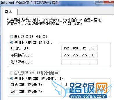4.找到多出来的那个本地连接3,右击属性----Internet 协议版本4(TCP/IPv4),输入下面的IP地址:IP地址是:192.168.42.1 子网掩码:255.255.255.0 ,首选DNS服务地址:8.8.8.8 其他的可以忽略。