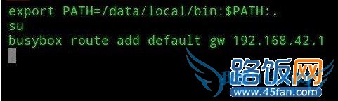 5.打开手机自带的终端模拟器,然后输入su回车,如果需要ROOT状态,点是就行了,然后输入 “busybox route add default gw 192.168.42.1 ”。回车之后我们就能用手机上网冲浪啦。
