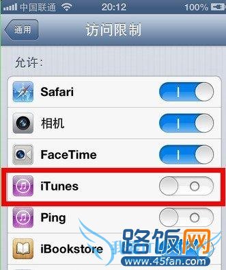 四、系统默认状态为关闭,若要打开访问限制,第一次需要输入二次密码。打开以后我们就可以关闭系统自带的应用软件了。比如我们不想使用系统自带的iTunes,就可以打iTunes右边的选项关闭,这样在手机的主屏上就不会出现iTunes了。关闭其它应用程序也是同样的操作方法。如下图所示: