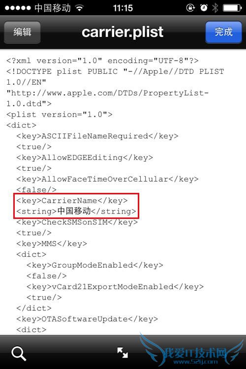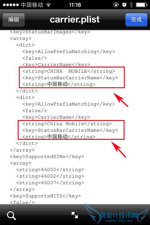 2、运营商图标修改一般就如下面图红色标记所注,只需按照下图代码进行相应编辑就能恢复到修改前状态,也就解决了ios7修改运营商图标后不能连接蜂窝网络的问题。