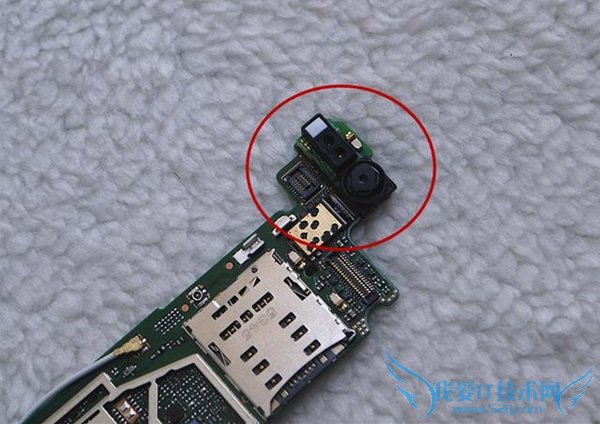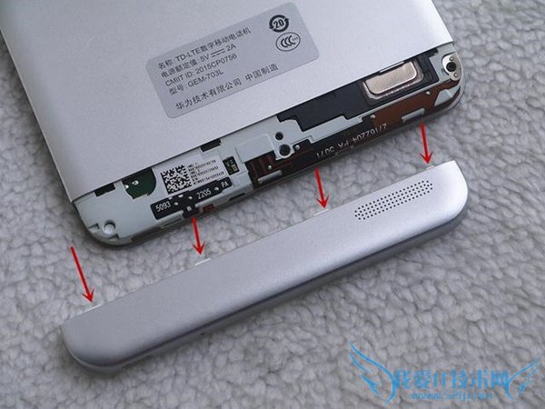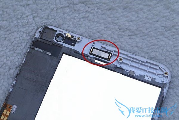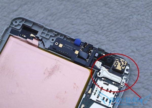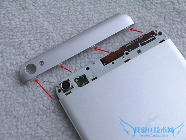 很顺利,就拆掉了顶部的小盖板,可以看见是用扣子来固定的,扣得相当的牢固,拆掉后,可以看见摄像头,闪光灯以天线等部件。