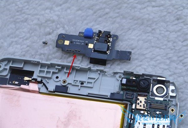 耳机接口和降噪处理器模块,也是通过排线连接,但是也有单独的螺丝固定。