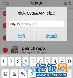 1、进入iPhone手机主屏幕,然后运行【cydia】,进入后点击“管理”——“编辑”——“添加”,在地址栏框中输入“http://apt.178.com”。如下图所示: