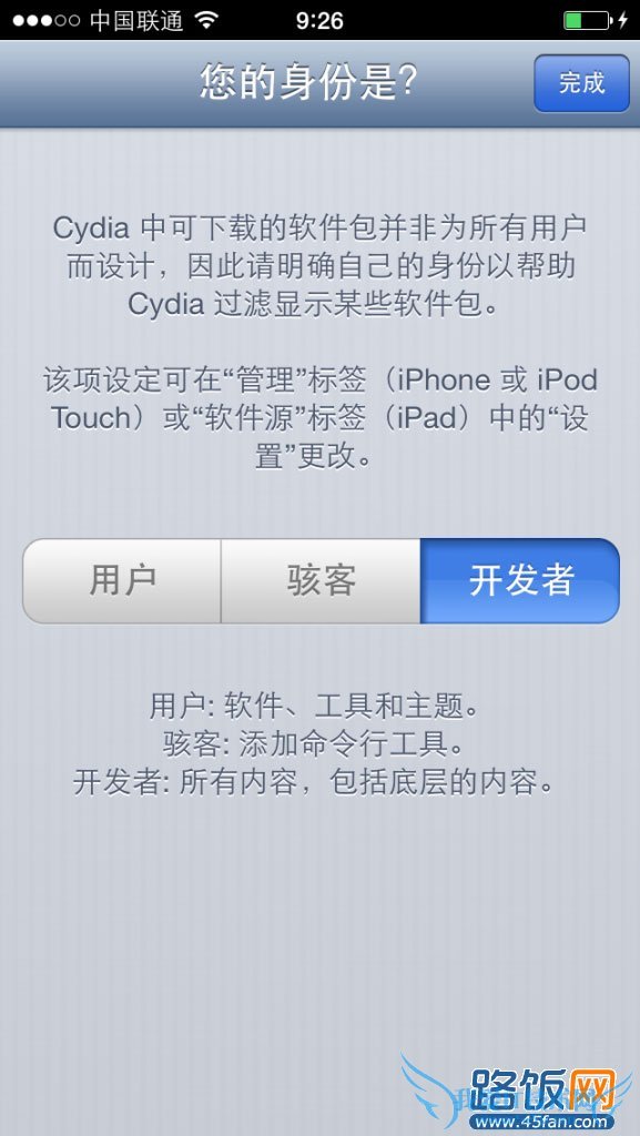 8、重启完后,再次点击Cydia进入,普通用户建议选择”用户“,高级用户可以选择”开发者“可以看到更多信息,最后点右上角”完成“。