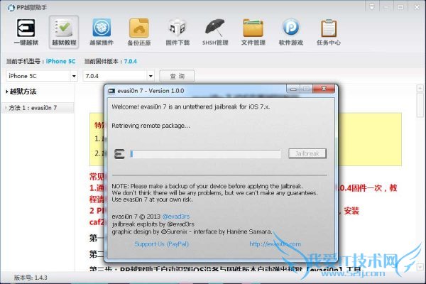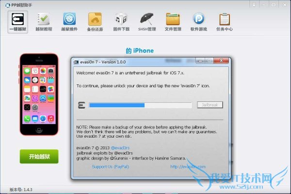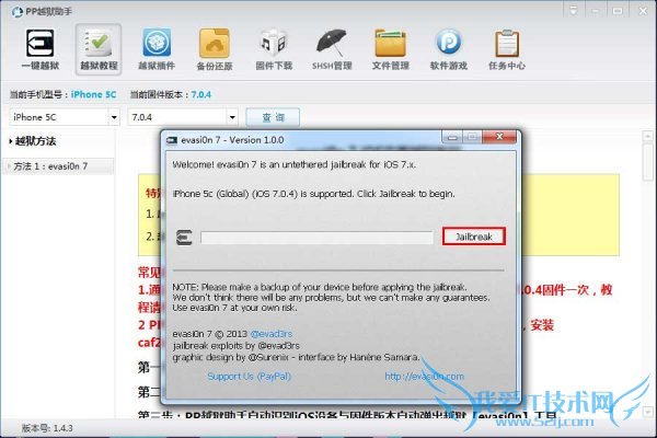 3、PP越狱助手自动识别iOS设备与固件版本自动弹出越狱【evasi0n 7】工具;