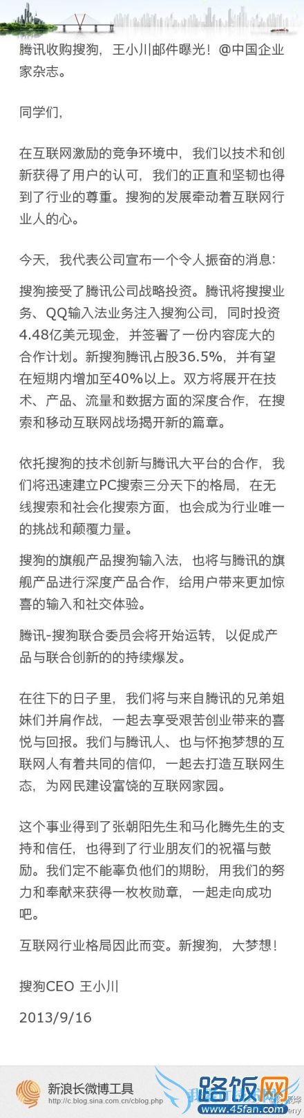 今天下午打开科技类网站,印入眼前的都是关于腾讯收购搜狗部分股份的新闻,这可谓2013年又一重磅交易。