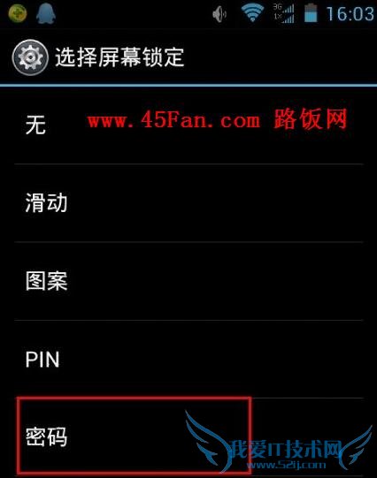 4、选择屏幕锁定可设置【滑动、图案、PIN、密码】解锁方式,咱们先以密码解锁为例,轻触【密码】选项。如下图所示: