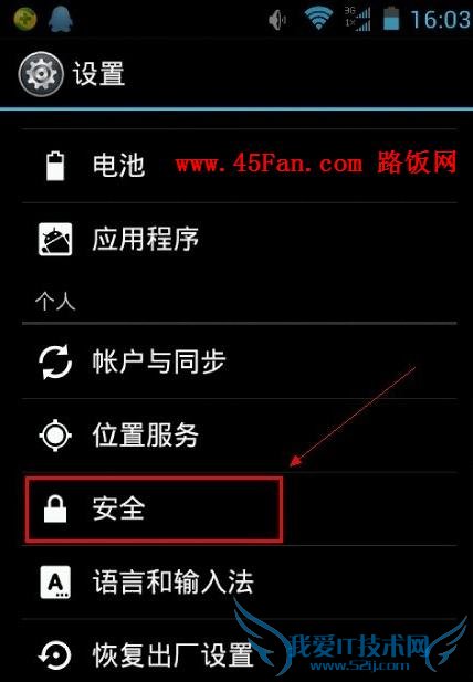 2、在设置列表下,轻触【安全】选项。如下图所示:
