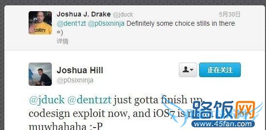 p0sixninja最近已经忍不住向众人分享他的成果了。近日在Twitter上看到p0sixninja发布的一则消息:“我已经完成新漏洞的代码签名,iOS 7将是我一个人的,阿哈哈哈哈。”从语气上看,p0sixninja的兴奋和自豪之情溢于言表,不知道到时候他与Evad3rs之间谁的动作更快呢?