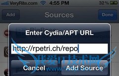 1、打开iPhone手机主屏幕,找到并打开Cydia,然后到【Manage/管理】 > 【Sources/管理源】> 【Edit/编辑】> 【Add/添加】中输入http://rpetri.ch/repo,如下图所示: