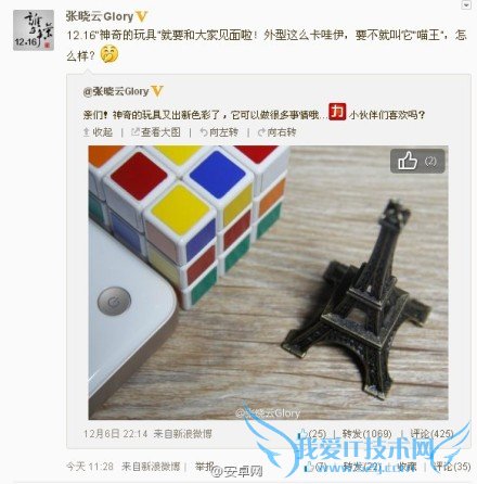 继11月17日雷军在微博上透露将推出”新玩具“后,华为也不甘寂寞,12月6日华为终端发言人张晓云美女在微博上发布消息称:12.6神奇的玩具就要和大家见面啦!从微博截图上看,一边是魔方,另一个物体类似于“埃菲尔铁塔”。