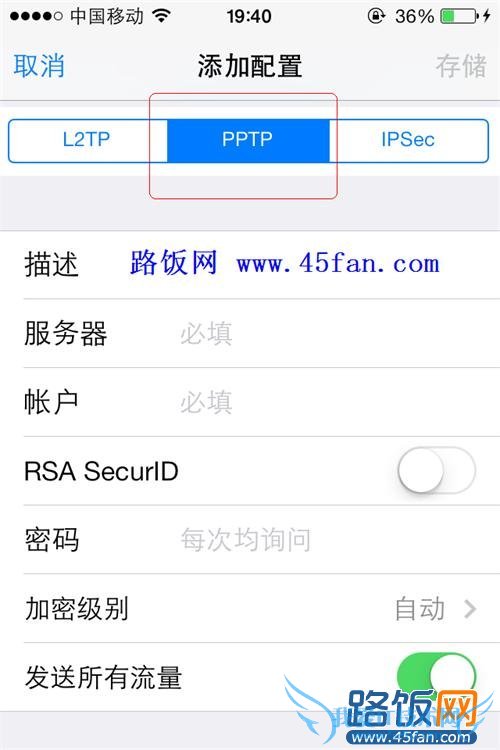 5、弹出VPN添加配置项,并选择PPTP,然后添加描述(可自由命名),然后添加正确的服务器地址及帐户和口令,并点击右上角的“存储”,如下图所示: