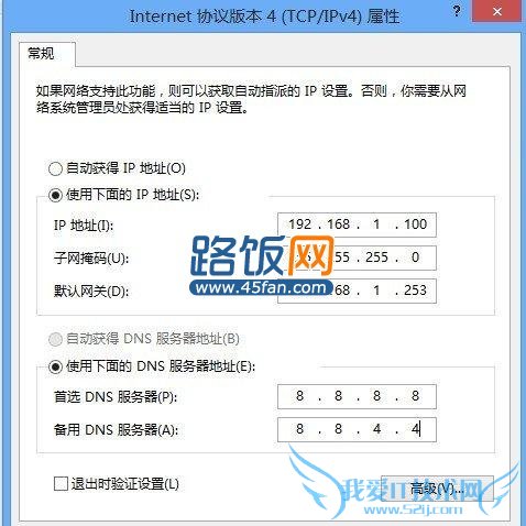 第二步:Windows 8默认选中“自动获得IP地址”和“自动获得DNS服务器地址”,我们只需要更改选中“使用下面 IP地址”和“使用下面的DNS服务器地址”,然后在下方的“IP地址”、“子网掩码”、“默认网管”和“首选DNS服务器”、“备用DNS服务器”输入需要修改的内容,最后单击“确定”即可。
