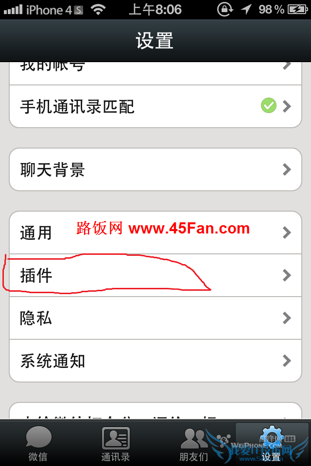 1、既然是使用微信备份,那肯定得先打开微信喽,然后点“设置”-“插件”选项,如下图所示: