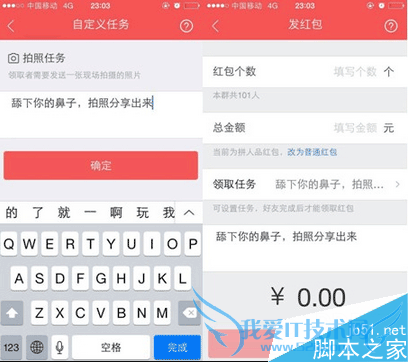 易信“任务红包”顾名思义就是在领取红包时先要完成红包任务。发红包的人可以指定红包的具体任务内容,比如,发红包的人可以要求其他人在领红包时发一张自拍照片,参与者点击“拍照片,领红包”后会自动打开图片功能,发送自拍照就可以成功领取红包。除了“任务红包”,用户在易信中还能自由选择发送“普通红包”和“拼人品红包”。