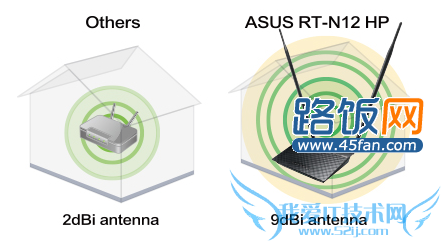 华硕RT-N12HP无线路由器搭载了两根9dBi高增益天线(普通无线路由器仅搭载2dBi或3dBi天线),配合独立设计的信号放大器,能大幅加强其无线接收能力,有效延伸家中已有的无线信号,增强无线信号的稳定性,扩展无线覆盖范围,使无线信号延伸近双倍的覆盖范围,让你再也不为找不到无线网络而烦恼。