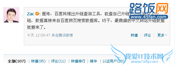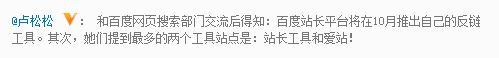 据搜索引擎业内资深人士ZAC及卢松松在微博中透露,百度将在10月,即本月推出属于自己的外链查询工具,这也意味着百度将推出一个真正靠谱的中文外链查询工具,我们都知道,一个网站的排名同外链有着密不可分的关系,外链质量越高,数量越多,则排名越好。这也成就了一句经典的话:内容为王,外链为皇!相关信息截图如下: