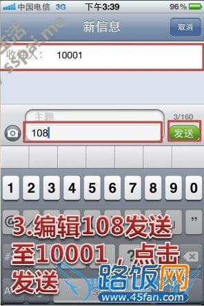 3、然后在收件人里输入10001,短信内容里面输入108,点击“发送”按钮