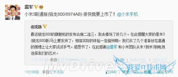 今天雷军在微博上第一时间@高通副总裁沈劲,并发消息称“小米3联通版(骁龙800/8974AB) 很快就要上市了!",沈劲在微博上感谢雷军和小米团队使用骁龙800版芯片并称体验效果将会超出预期。以下为微博截图: