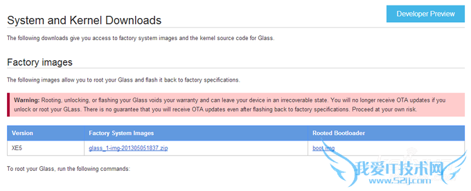 谷歌眼镜开发者版上市后不久就被黑客破解,现在谷歌为向开发者和黑客示好,发布了谷歌眼镜XE5版固件的系统镜像文件和解锁后的bootloader文件,同时谷歌也声称刷机仍存在风险。