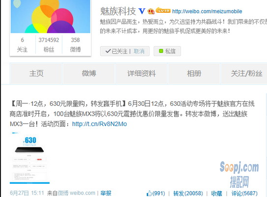 昨天下午,魅族科技官方微博宣布:周一·12点,630元限量购,转发赢手机】6月30日12点,630活动专场将于魅族官方在线商店准时开启,100台魅族MX3将以630元震撼优惠价限量发售。转发本微博,送出魅族MX3一台!