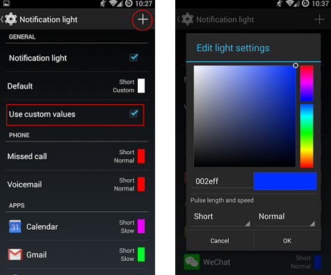 在 Display & lights 中点击 Notification light 就可以为不同的应用配置不同的颜色。还可以设置亮灯的频率和时长。我一般微信用蓝色,电子邮件用绿色,Hangout用黄色。