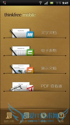 ThinkFree Office的初始界面像一款真皮的名片夹,主要功能被夹在四个卡屉中,而工具栏则放置于界面底部。软件以米黄色调为主,背景有皮革材质纹理,非常逼真,也很符合商务风格。