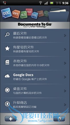 Documents To Go:除了支持本地文件的常功能外,Documents To Go还支持打开储存在Google账户的文件,而且支持与桌面计算机同步。在本地文件的管理方面,可以通过添加星号来标记文件,表记录星号的文件会通过另一单独入口浏览打开,非常便捷。