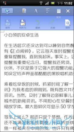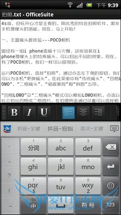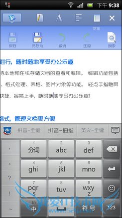 在编辑界面,Quickoffice Pro将工具栏放置在底部,而且是隐藏式,需要用手机菜单键唤出。工具栏在输入法开启时不会自动上推,而且竟然采用了两级菜单,虽然设计精美,但在实用性方面大打折扣。